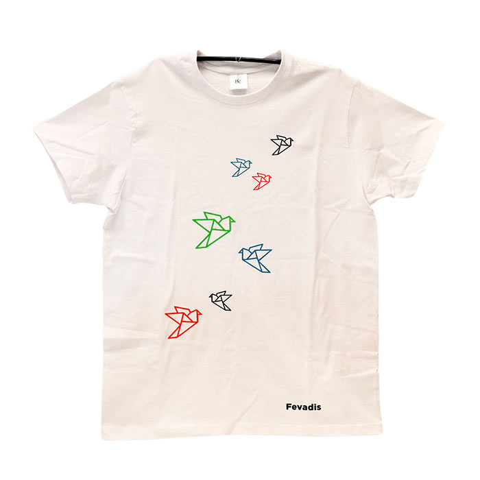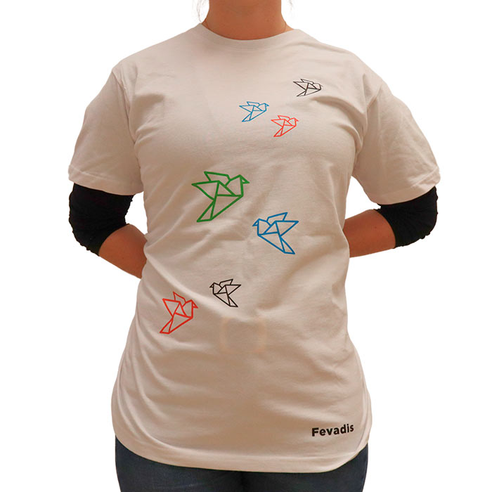Camiseta blanca. Camiseta de Fevadis de colores sobre fondo blanco. Alza el vuelo con nosotras.